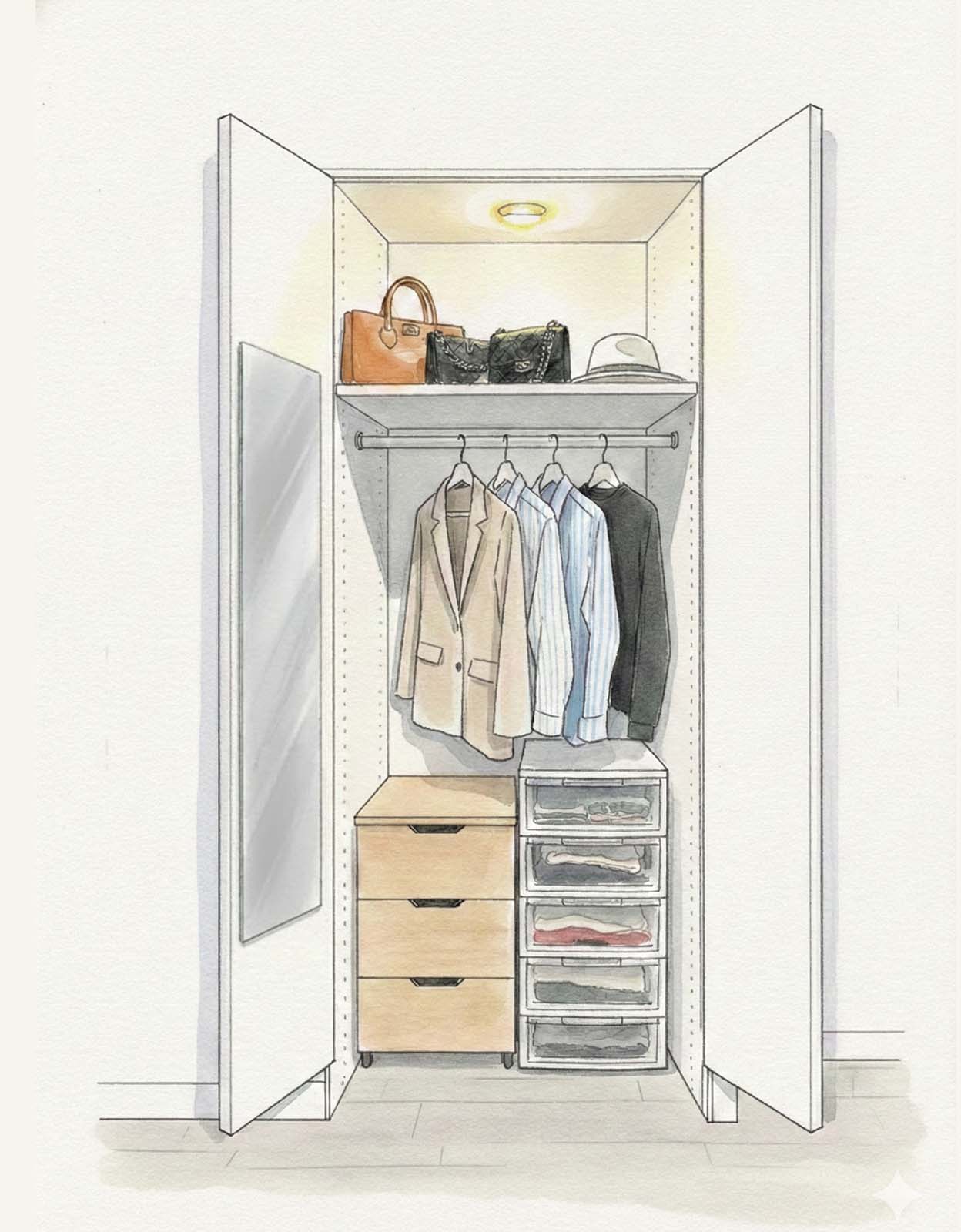 デスクを取り外し、通常収納への変更も可能。衣類や日用品を見せないことで、生活感を抑えられます。